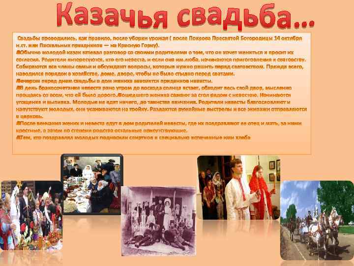 Обычно в году выделялось три свадебных периода: Осенний (от Успения до Филипповки) Зимний (от Крещения до Масленицы) Весенний (от Красной горки до Троицы) Благоприятным для брака является возраст от 18 до 20 лет.