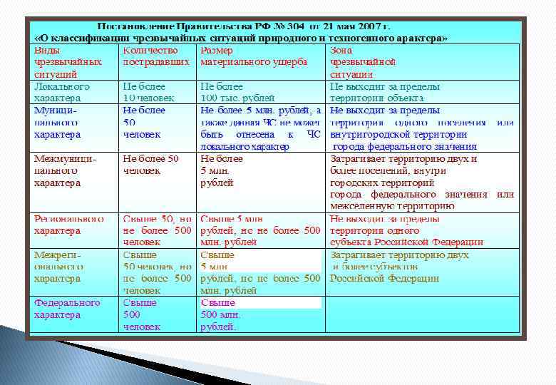 ЛИТЕРАТУРА: 1. ФЗ РФ от 21. 12. 1994 г. № 68. «О защите населения и территорий от ЧС природного и техногенного характера» . 2. Постановление правительства РФ от 21 мая 2007 г. № 304 «О классификации ЧС природного и техногенного характера» . 3. ФЗ РФ от 21. 07. 1997 г. № 116 « О промышленной безопасности опасных производственных объектов» . 4. Постановление Правительства РФ от 30. 12. 2003 г. № 794 «О единой государственной системе предупреждения и ликвидации чрезвычайных ситуаций» , с изменениями постановления Правительства РФ от 27. 05 2005 г. № 335 5. Закон Санкт-Петербурга от 20. 10. 2005 г. № 514 -76. «О защите населения и территорий от ЧС природного и техногенного характера в Санкт – Петербурге» 6. Приказ МЧС России от 08. 07. 2004 г. № 329 «Об утверждении критериев информации о ЧС» . 7. ГОСТ 22. 0. 02 - 94 «БЧС. Термины и определения» 8. ГОСТ 22. 0. 03 - 95 «БЧС. Природные ЧС» . 9. ГОСТ 22. 0. 05 - 94 «БЧС. Техногенные ЧС » . 10. ГОСТ 22. 0. 07 - 95 «БЧС. Источники техногенных ЧС» .