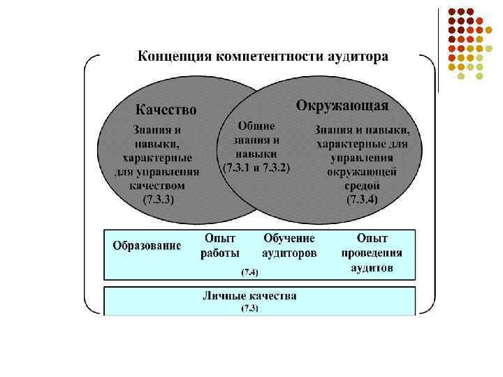 Знания и навыки (р. 7. 3) Общие для аудиторов систем менеджмента качества и окружающей среды: G принципы, процедуры и методы аудита G система менеджмента и ссылочные документы G принципы функционирования проверяемой организации G применяемые законы, нормы и отраслевые требования