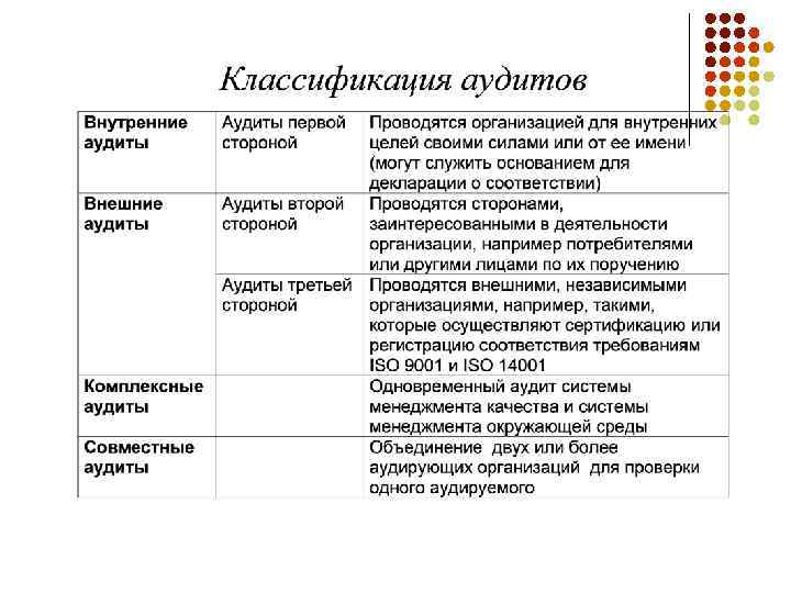n. В зависимости от целей аудита область аудита может охватывать не всю систему, а отдельные элементы системы, или выполнение отдельных требований стандартов Аудит по вертикали и аудит по горизонтали