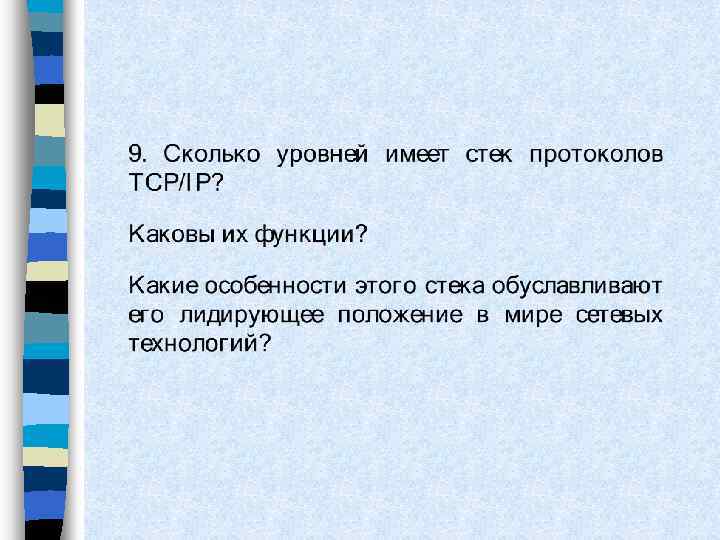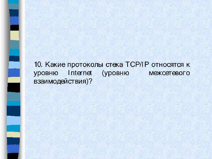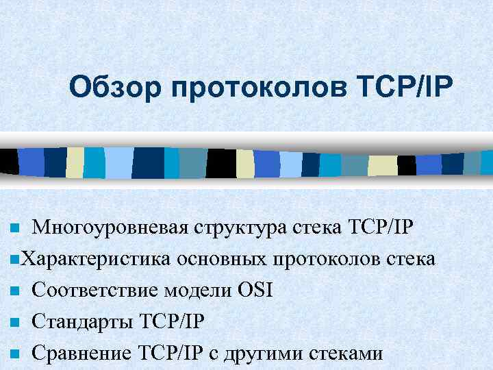 Обзор протоколов TCP/IP n Многоуровневая структура стека TCP/IP n. Характеристика основных протоколов стека n Соответствие модели OSI n Стандарты TCP/IP n Сравнение TCP/IP с другими стеками