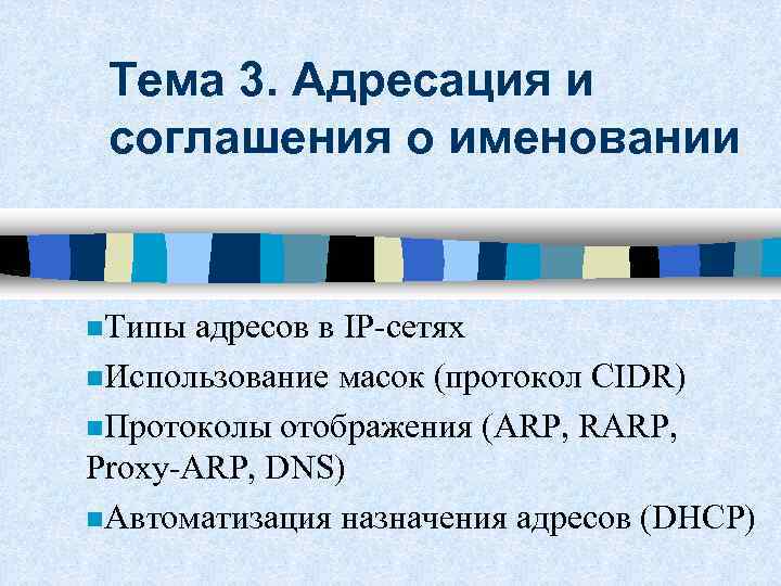 Тема 3. Адресация и соглашения о именовании n. Типы адресов в IP-сетях n. Использование масок (протокол CIDR) n. Протоколы отображения (ARP, RARP, Proxy-ARP, DNS) n. Автоматизация назначения адресов (DHCP)