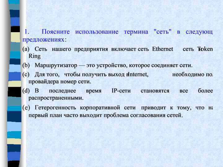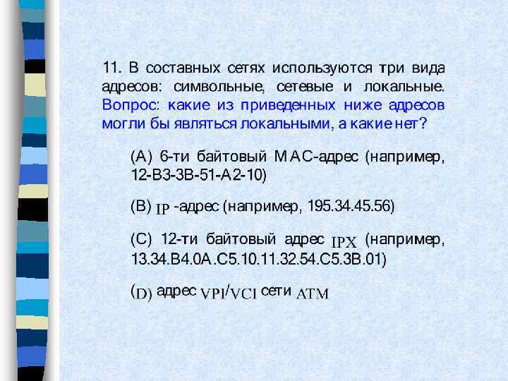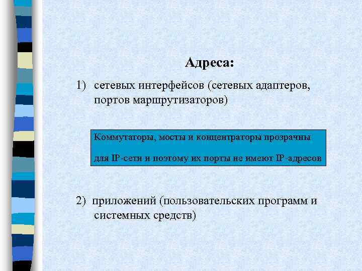 Адреса: 1) сетевых интерфейсов (сетевых адаптеров, портов маршрутизаторов) Коммутаторы, мосты и концентраторы прозрачны для IP-сети и поэтому их порты не имеют IP-адресов 2) приложений (пользовательских программ и системных средств)