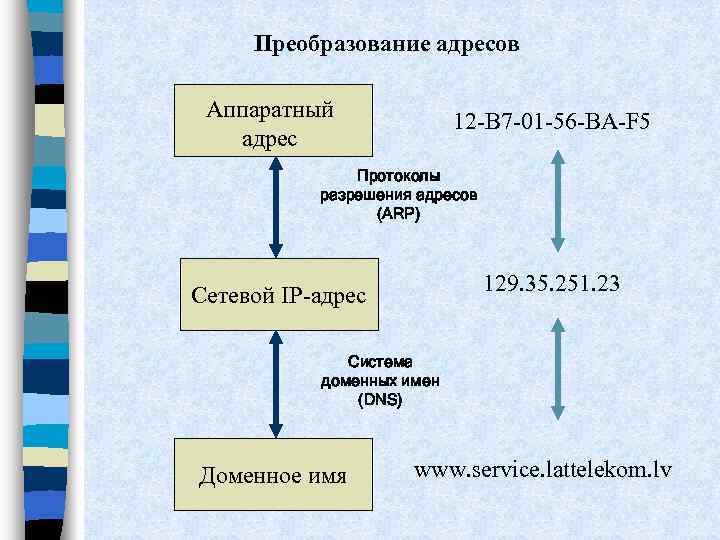 Преобразование адресов Аппаратный адрес 12 -B 7 -01 -56 -BA-F 5 Протоколы разрешения адресов (ARP) 129. 35. 251. 23 Сетевой IP-адрес Система доменных имен (DNS) Доменное имя www. service. lattelekom. lv