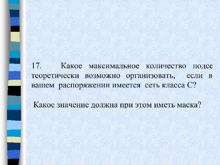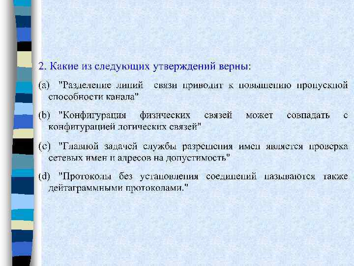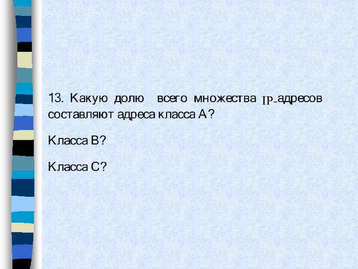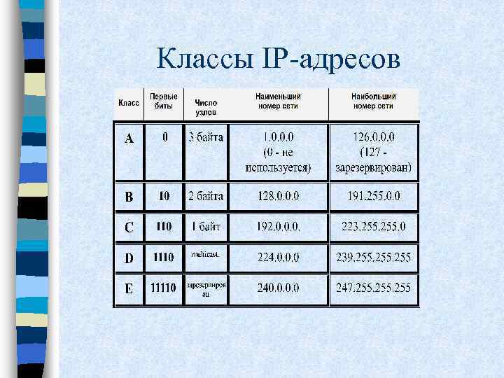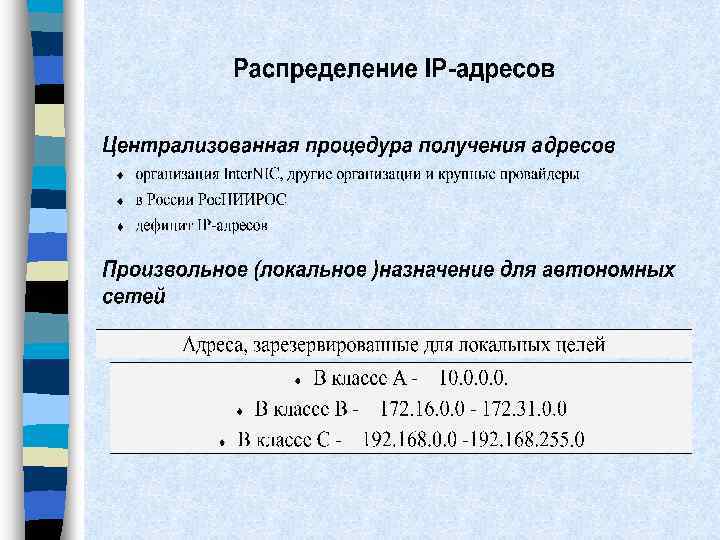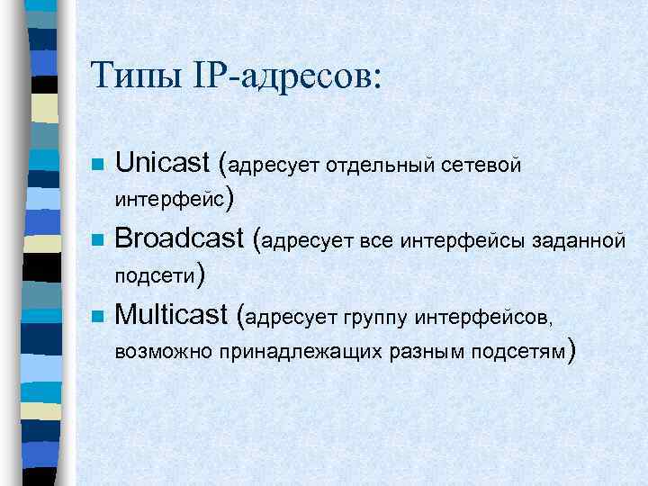 Типы IP-адресов: n n n Unicast (адресует отдельный сетевой интерфейс) Broadcast (адресует все интерфейсы заданной подсети) Multicast (адресует группу интерфейсов, возможно принадлежащих разным подсетям)