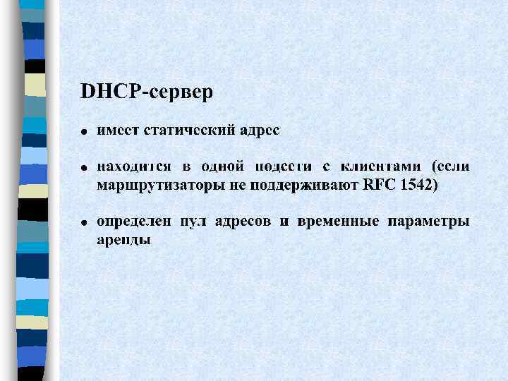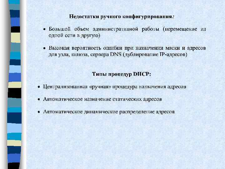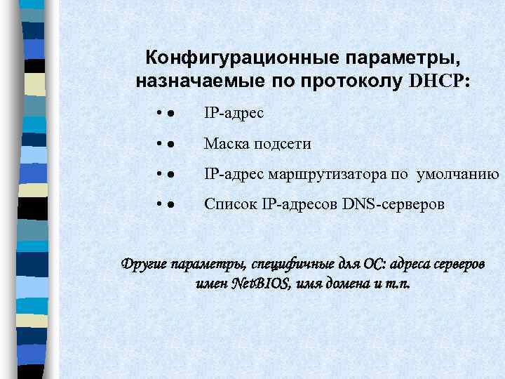 Конфигурационные параметры, назначаемые по протоколу DHCP: • · IP-адрес • · Маска подсети • · IP-адрес маршрутизатора по умолчанию • · Список IP-адресов DNS-серверов Другие параметры, специфичные для ОС: адреса серверов имен Net. BIOS, имя домена и т. п.