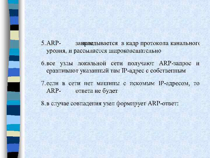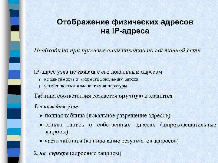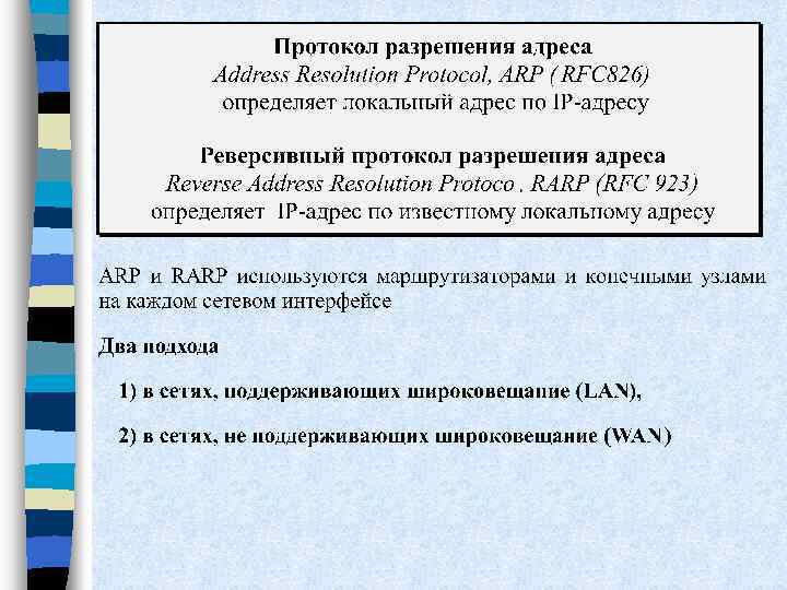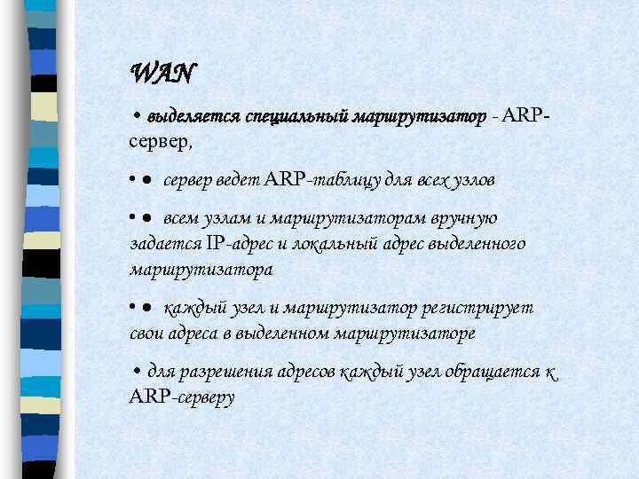WAN • выделяется специальный маршрутизатор - ARPсервер, • · сервер ведет ARP-таблицу для всех узлов • · всем узлам и маршрутизаторам вручную задается IP-адрес и локальный адрес выделенного маршрутизатора • · каждый узел и маршрутизатор регистрирует свои адреса в выделенном маршрутизаторе • для разрешения адресов каждый узел обращается к ARP-серверу