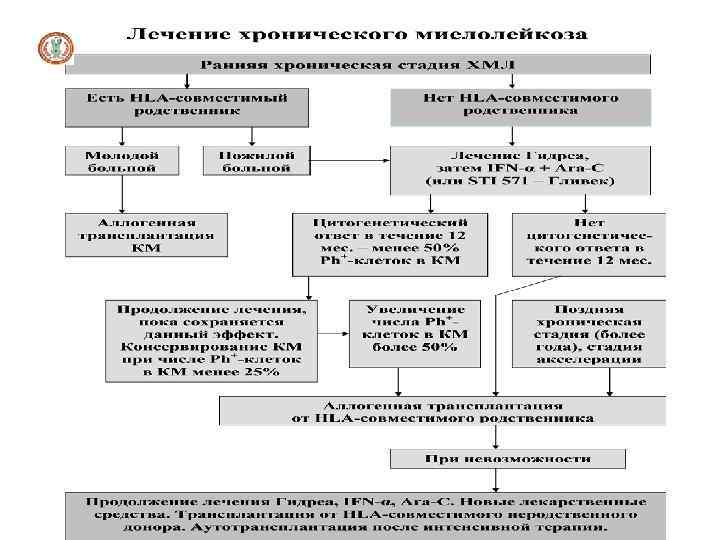 Лечение при хроническом миелолейкозе Лечение в терминальной стадии хронического миелолейкоза при наличии бластных клеток в периферической крови проводят по схемам острого миелобластного лейкоза. ВАМП, ЦАМП, АВАМП, ЦОАП, сочетание винкристина с преднизолоном, цитозара с рубомицином. Терапия направлена на продление жизни больного, так как получить ремиссию в этом периоде трудно. При развитии бластного криза проводится лечение по соответствующему протоколу, в зависимости от его варианта (лимфобластный или миелобластный)