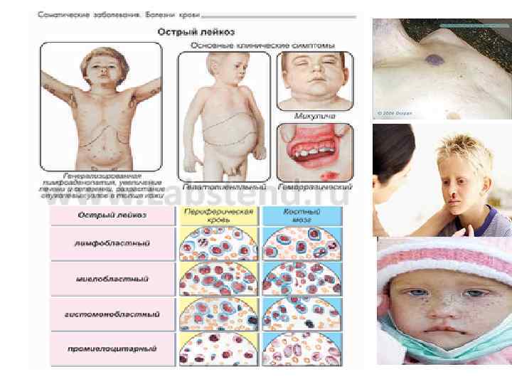 Клиническая картина острых лейкозов (синдромы) • Анемический синдром: бледность, одышка, сердцебиение, сонливость. • Инфекционно-некротический синдром (склонность к инфекциям бактериальным, грибковым и вирусным). • Геморрагический синдром. При осмотре выявляют петехии и экхимозы на коже (самопроизвольные, в местах инъекций, механического трения). Возможны интенсивные носовые и тяжёлые внутренние кровотечения (метроррагии, желудочно-кишечные кровотечения, кровоизлияния в мозг). • Гиперпластический синдром (лимфаденопатия): лимфатические узлы множественные, плотные, эластичные, округлые, могут быть спаяны друг с другом, разных размеров (от 1 до 8 см); их пальпация безболезненна, увеличение брыжеечных лимфатических узлов, гипертрофия червеобразного отростка, гипертрофия внутригрудных лимфатических узлов. Печень и селезёнка увеличены. Гипертрофия дёсен, лейкемиды кожи (специфические узелки). В средостение наблюдается гипертрофия тимуса, что может вызвать сдавление органов средостения)