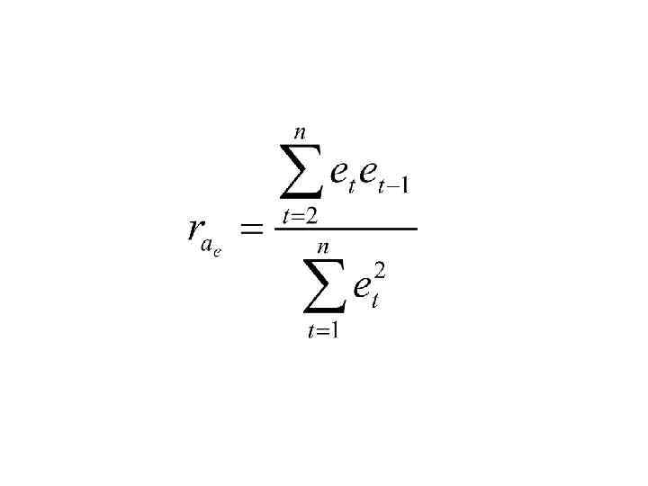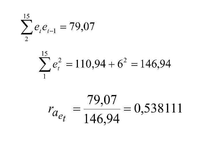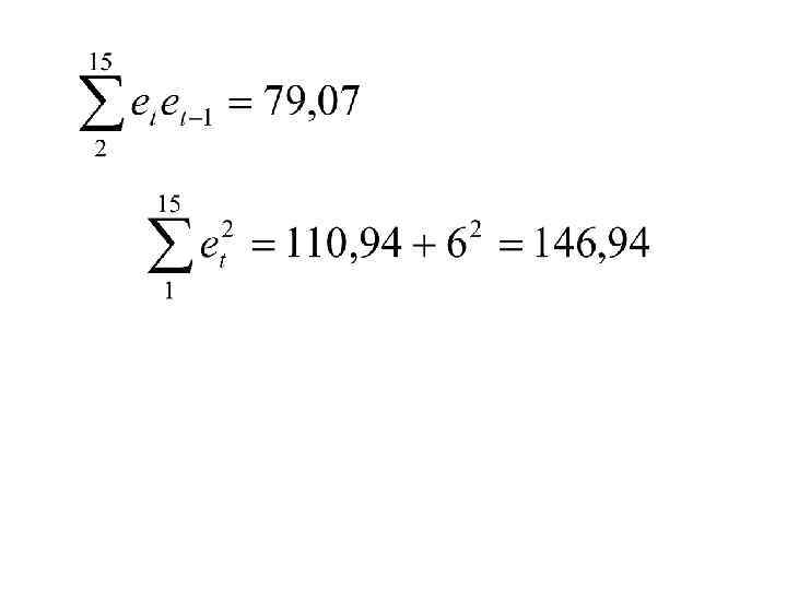 t 1 2 3 4 5 6 7 8 9 10 11 12 13 14 15 Σ еt 6 0, 2 -2, 6 -4 -5 -3, 1 0, 7 2, 8 2, 5 2, 9 3, 3 1, 6 -1, 0 -4 -0, 3 -6* еt-1 6 0, 2 -2, 6 -4 -5 -3, 1 0, 7 2, 8 2, 5 2, 9 3, 3 1, 6 -1 -4 0, 3 еtеt-1 1, 2 -0, 52 10, 4 20 15, 5 2, 17 1, 96 7 7, 25 9, 57 5, 28 -1, 6 4 1, 2 79, 07 еt 2 0, 04 6, 76 16 25 9, 61 0, 49 7, 84 6, 25 8, 41 10, 89 2, 56 1 16 0, 09 110, 94 еt-12 36 0, 04 6, 76 16 25 9, 61 0, 49 7, 84 6, 25 8, 41 10, 89 2, 56 1 16 146, 85