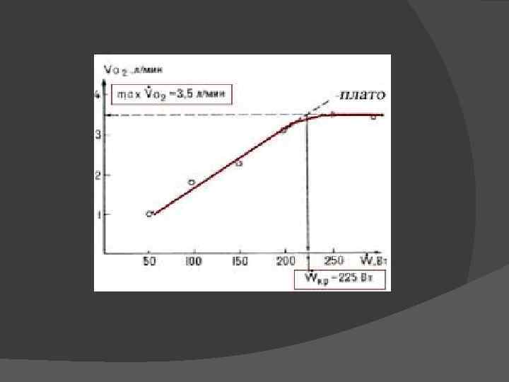 Прямой метод определения МПК В определенный момент, несмотря на дальнейшее повышение мощности работы, цифра поглощения кислорода перестает увеличиваться. Это и есть МПК. У спортсменов высокого класса достигает 5, 5 -6, 0 -6, 5 литров O 2/мин при легочной вентиляции 180 -220 л/мин.