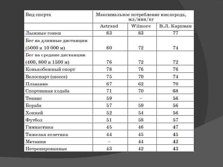 Таблица 1. Максимальное потребление кислорода у спортсменов, специализирующихся в разных видах спорта(Салтин, Астранд, 1967) Контингент Абсолютная величина МПК(л/мин) Относительная величина МПК(мл/кг/мин) Нетренированные 3, 1 44 Лыжники 5, 6 83 Стайеры 4, 8 79 Средневики 5, 4 75 Гимнасты 3, 9 60