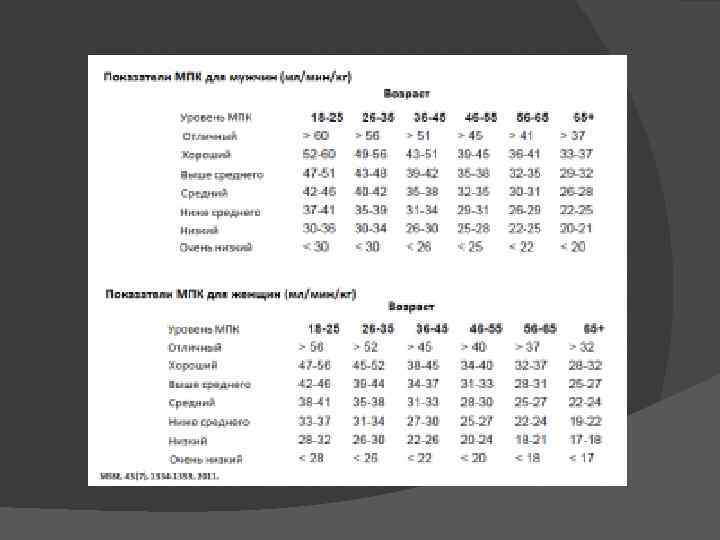 В следующей таблице приведены рекомендации Американского Колледжа Спортивной Медицины по значениям МПК.