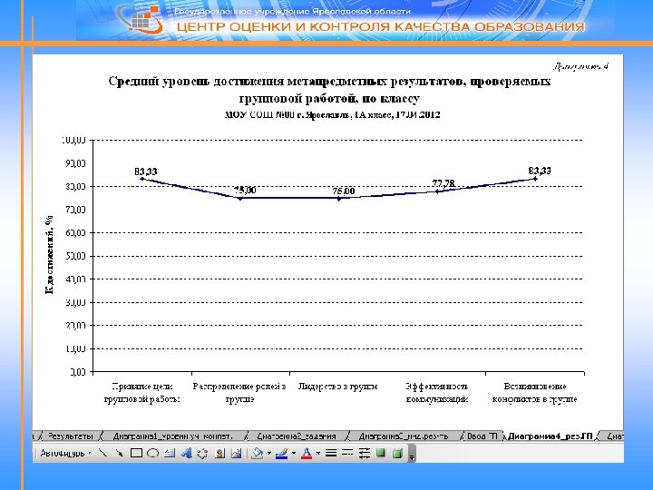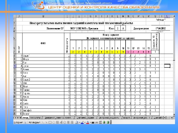 Система оценивания метапредметных результатов «Основное содержание оценки метапредметных результатов в начальной школе строится вокруг умения учиться, т. е. той совокупности способов действий, которая, собственно, и обеспечивает способность обучающихся к самостоятельному усвоению новых знаний и умений, включая организацию этого процесса» . Оценка метапредметных результатов осуществляется в ходе различных процедур поэтапно: 1. Оценивание комплексной письменной работы: – обучающегося; – класса. 2. Оценивание проектной деятельности: – группы; – класса. 3. Обобщение результатов выполнения комплексной проверочной работы на межпредметной основе по классу. Результаты обучающихся (в баллах) заносятся в электронные таблицы. Обработка результатов, построение диаграмм осуществляется программой автоматически.