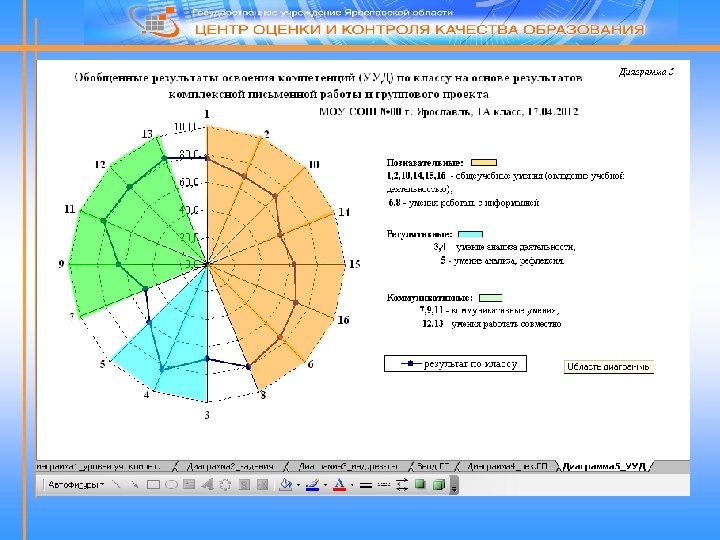 Обобщение результатов выполнения комплексной проверочной работы на межпредметной основе по классу Количественной характеристикой освоения каждой из 16 УУД является успешность освоения метапредметной компетенции. Успешность освоения метапредметной компетенции – это отношение среднего балла по классу, полученного по всем заданиям комплексной письменной работы и группового проекта, к максимально возможному баллу, который можно набрать за задания, относящиеся к этой компетенции, выраженное в процентах. Для получения обобщённых данных за выполнение комплексной работы по 16 метапредметным компетенциям необходимо заполнить две электронные таблицы. В разработанном программном обеспечении, после занесения баллов в электронные таблицы, успешность освоения 16 метапредметных компетенций по классу рассчитается автоматически. Результаты предоставляются в виде лепестковой диаграммы.