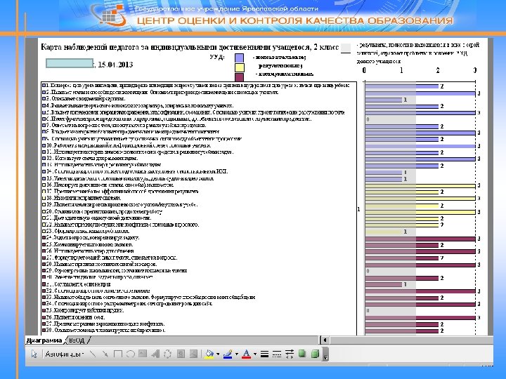 Карта наблюдений педагога за индивидуальными достижениями обучающегося Для оценивания продвижения обучающихся в достижении метапредметных результатов предлагается карта наблюдений педагога за индивидуальными достижениями обучающегося. Карта наблюдений педагога выступает как элемент формирующего оценивания, позволяющий «накапливать информацию о состоянии и прогрессе обучающихся, на основании которого осуществляется коррекция или улучшение учебного процесса» (М. А. Пинская). Карта наблюдений включает 38 метапредметных умений (действий), разработанных с учетом возрастных особенностей обучающихся, а также года обучения. За основу выделенных универсальных учебных действий взяты планируемые метапредметные результаты, которые должен достигнуть ребенок к моменту окончания начальной школы (приложение 12). По заданному шаблону формируются электронные таблицы на каждого ученика, и после ввода оценок результаты представляются в виде диаграмм (карта наблюдений разработана в электронном формате MS Excel).