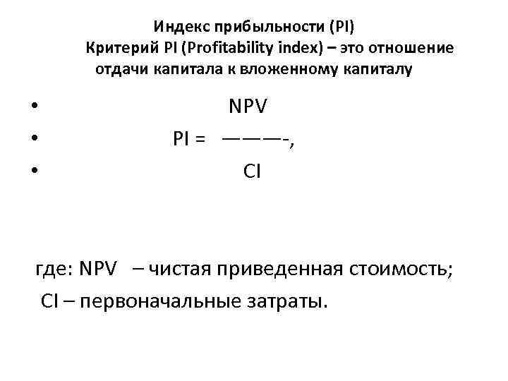 Индекс прибыльности (PI) Критерий PI (Profitability index) – это отношение отдачи капитала к вложенному капиталу • NPV • PI = ———-, • CI где: NPV – чистая приведенная стоимость; CI – первоначальные затраты.