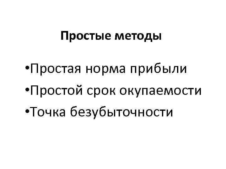 Простые методы • Простая норма прибыли • Простой срок окупаемости • Точка безубыточности