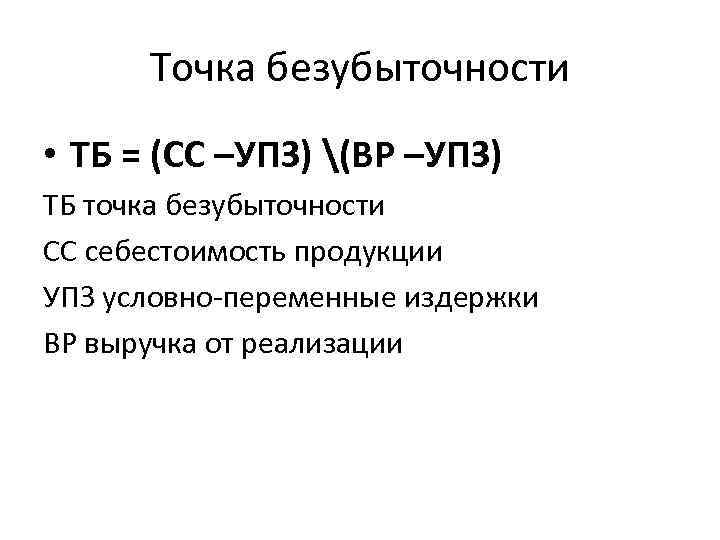 Точка безубыточности • ТБ = (СС –УПЗ) (ВР –УПЗ) ТБ точка безубыточности СС себестоимость продукции УПЗ условно-переменные издержки ВР выручка от реализации