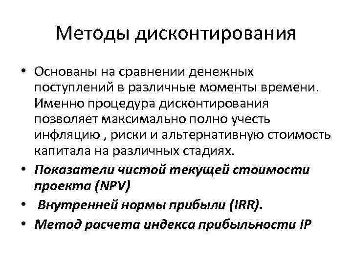 Методы дисконтирования • Основаны на сравнении денежных поступлений в различные моменты времени. Именно процедура дисконтирования позволяет максимально полно учесть инфляцию , риски и альтернативную стоимость капитала на различных стадиях. • Показатели чистой текущей стоимости проекта (NPV) • Внутренней нормы прибыли (IRR). • Метод расчета индекса прибыльности IP