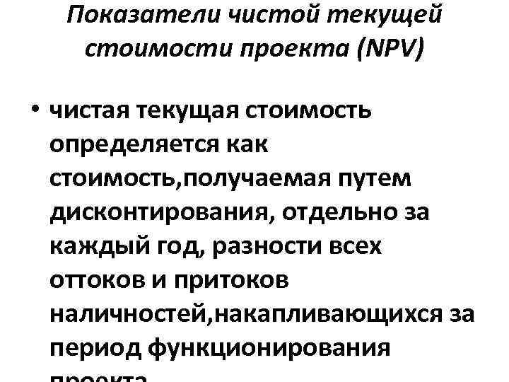 Показатели чистой текущей стоимости проекта (NPV) • чистая текущая стоимость определяется как стоимость, получаемая путем дисконтирования, отдельно за каждый год, разности всех оттоков и притоков наличностей, накапливающихся за период функционирования