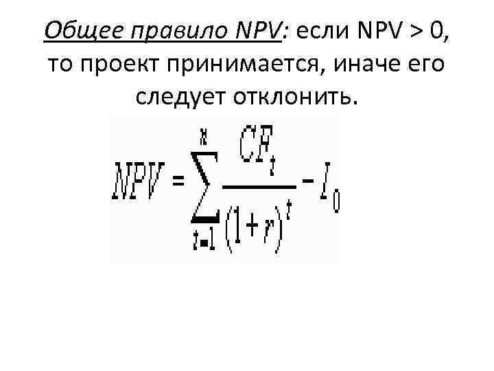 Общее правило NPV: если NPV > 0, то проект принимается, иначе его следует отклонить.
