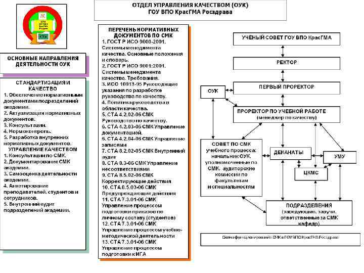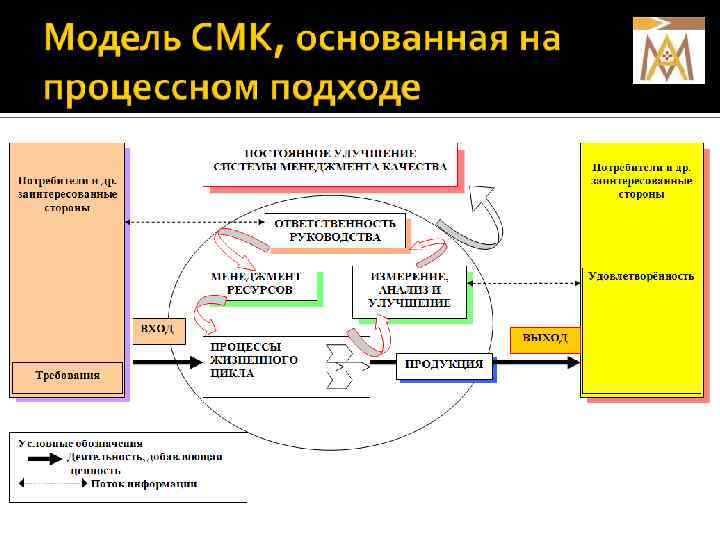 Постоянное улучшение СМК ПОТРЕБИ ТЕЛИ УСЛУГ, ПРОИЗВ ОДИМЫХ АКАДЕМ ИЕЙ (АБИТУРИЕ НТЫ, СТУДЕНТЫ, ОБУЧАЮЩИ ЕСЯ КУРСАНТЫ ПО, ЛПУ) ТРЕБОВ АНИЯ И ОЖИДА НИЯ Менеджмент ресурсов 1. Обеспечение ресурсами (п. 6. 1) 2. Человеческие ресурсы (п. 6. 2) 3. Инфраструктура (п. 6. 3) 4. Производственная среда (6. 4) 6. Финансовые ресурсы 7. Отношения с поставщиками и партнёрами (школы, колледжи, училища) 8. Информация ВХОД Требования Процессы, осуществляемые высшим руководством 1. Разработка политики (п. 5. 3) 2. Разработка и развёртывание целей в области качества (5. 4. 1) 3. Планирование создания и развития СМК (п. 5. 4. 2) 4. Определение ответственности и делегирование полномочий (п. 5. 5. 1) 5. Внутренний обмен информацией, в том числе по результативности СМК (п. 5. 5. 3) 6. Анализ со стороны руководства (п. 5. 6) Процессы жизненного цикла подготовки специалиста 1. Планирование процесса жизненного цикла (п. 7. 1) 2. Маркетинг (п. 7. 2) 3. Отбор абитуриентов 4. Производство и обслуживание (п. 7. 5) 5. Контроль средств мониторинга и измерений (7. 6) Процессы измерения, анализа и улучшения • Мониторинг и оценка удовлетворённости потребителей (п. 8. 2. 1) • Внутренние аудиты (п. 8. 2. 2) • Мониторинг и измерение процессов (п. 8. 2. 3) • Мониторинг и измерение продукции (8. 2. 4) • Управление несоответствиями (п. 8. 3) • Анализ данных (п. 8. 4) • Улучшение (п. 8. 5) • Корректирующие действия (п. 8. 5. 2) • Предупреждающие действия (п. 8. 5. 3) Система менеджмента качества (СМК) 1. Требования к документации СМК (4. 2) 2. Руководство по качеству (п. 4. 2. 2) 3. Управление документацией (п. 4. 2. 3) 4. Управление записями (п. 4. 2. 4) (ЛПУ, ОРГАНИЗАЦИИ) УДОВЛЕТ ВОРЁННО СТЬ ВЫХОД Продукция (услуга) дипломированный специалист (врач) Прямая связь ПОТРЕБИТЕ ЛИ И ДРУГИЕ ЗАИНТЕРЕС ОВАННЫЕ СТОРОНЫ Обратная связь