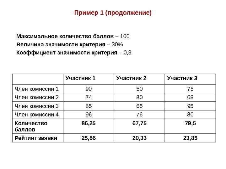 Пример 1 (продолжение) Участник 1 Участник 2 Участник 3 Член комиссии 1 90 50 75 Член комиссии 2 74 80 68 Член комиссии 3 85 65 95 Член комиссии 4 96 76 80 Количество баллов 86, 25 67, 75 79, 5 Рейтинг заявки 25, 86 20, 33 23, 85 Максимальное количество баллов – 100 Величина значимости критерия – 30% Коэффициент значимости критерия – 0,