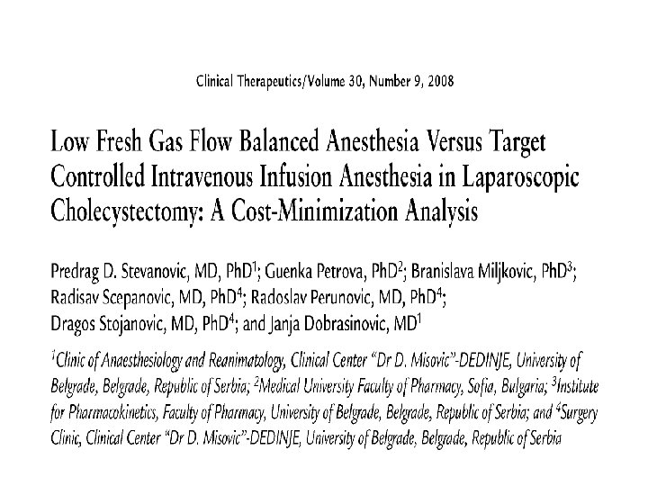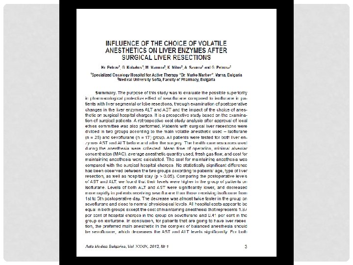 РЕЗУЛТАТИТЕ: ВЛИЯНИЕ НА ИЗБОРА НА ИНХАЛАЦИОНЕН АНЕСТЕТИК ВЪРХУ ЧЕРНОДРОБНИТЕ ЕНЗИМИ СЛЕД ЧЕРНОДРОБНА РЕЗЕКЦИЯ - РАЗХОДИ • При пациенти с чернодробна резекция, Севофлуран би трябвало да е предпочитания анестетик, тъй като намалява сигнификантно по-бързо повишените нива на AST и ALT • Разходите свързани с операцията са сходни/еднакви между двете групи пациенти. • Разходът само за анестетик представляват 1. 67% от цялата стойност на операцията при пациентите на Севофлуран и 0. 41% при тези на Изофлуран. • Изборът на анестетик трябва да се базира на очакваните клинични резултати, а не на икономически такива. Авторско наблюдение К. Петров 1, Г. Кобаков 1, М. Манова 2, К. Митов 2, А. Савова 2, Г. Петрова 21 СОБАЛ “д-р М. Марков” Варна 2 МУ – София, Фармацевтичен факултет