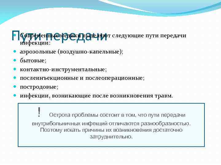 Пути передачи Современные медики выделяют следующие пути передачи инфекции: аэрозольные (воздушно-капельные); бытовые; контактно-инструментальные; послеинъекционные и послеоперационные; постродовые; инфекции, возникающие после возникновения травм. ! Острота проблемы состоит в том, что пути передачи внутрибольничных инфекций отличаются разнообразностью. Поэтому искать причины их возникновения достаточно затруднительно.