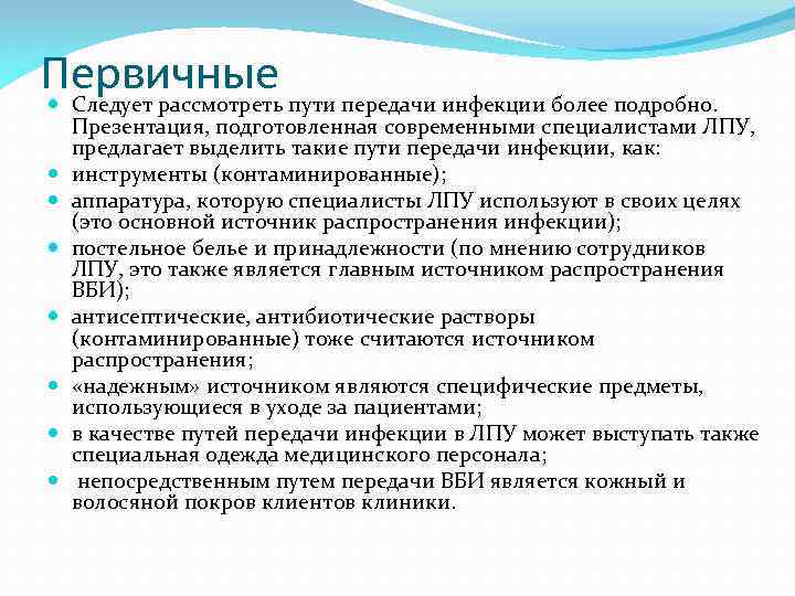 Первичные пути передачи инфекции более подробно. Следует рассмотреть Презентация, подготовленная современными специалистами ЛПУ, предлагает выделить такие пути передачи инфекции, как: инструменты (контаминированные); аппаратура, которую специалисты ЛПУ используют в своих целях (это основной источник распространения инфекции); постельное белье и принадлежности (по мнению сотрудников ЛПУ, это также является главным источником распространения ВБИ); антисептические, антибиотические растворы (контаминированные) тоже считаются источником распространения; «надежным» источником являются специфические предметы, использующиеся в уходе за пациентами; в качестве путей передачи инфекции в ЛПУ может выступать также специальная одежда медицинского персонала; непосредственным путем передачи ВБИ является кожный и волосяной покров клиентов клиники.
