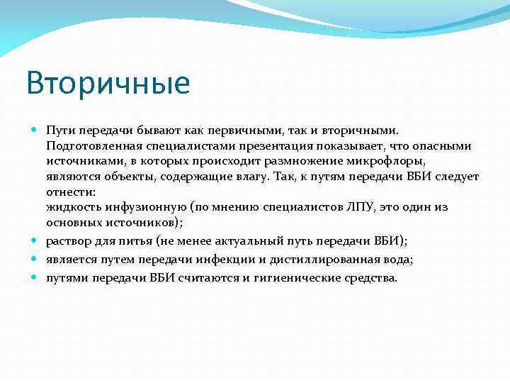 Вторичные Пути передачи бывают как первичными, так и вторичными. Подготовленная специалистами презентация показывает, что опасными источниками, в которых происходит размножение микрофлоры, являются объекты, содержащие влагу. Так, к путям передачи ВБИ следует отнести: жидкость инфузионную (по мнению специалистов ЛПУ, это один из основных источников); раствор для питья (не менее актуальный путь передачи ВБИ); является путем передачи инфекции и дистиллированная вода; путями передачи ВБИ считаются и гигиенические средства.