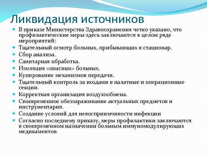 Ликвидация источников В приказе Министерства Здравоохранения четко указано, что профилактические меры здесь заключаются в целом ряде мероприятий: Тщательный осмотр больных, прибывающих в стационар. Сбор анализа. Санитарная обработка. Изоляция «опасных» больных. Купирование механизмов передачи. Тщательный контроль за входами в палатные и операционные секции. Корректная организация воздухообмена. Своевременное обеззараживание актуальных предметов и инструментария. Создание условий для невосприимчивости инфекции Согласно последнему приказу, меры профилактики заключаются в своевременном назначении больным иммуномодулирующих медикаментов.