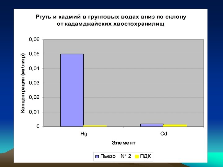 . . Содержание ртути в воде различного назначения • По данным исследований воды на отдельных объектах комбината (шахтные воды; стоки обогатительной фабрики, бетонного завода; вода арыков и водоемов у отвала огарков), содержание ртути колебалось от 0, 27 до 5, 58 мкг/л, что в 5, 4 111, 6 раза выше фонового содержания ртути в воде реки Галуян (0, 05 мкг/л). • В реке Галуян концентрация ртути небольшая (в среднем не выше 0, 1 мкг/л), что соответствует фоновым концентрациям для открытых водоисточников. • Содержание ртути в воде ирригационной сети превышало фоновые значения для воды данного региона в среднем в 1, 4 -5, 0 раза