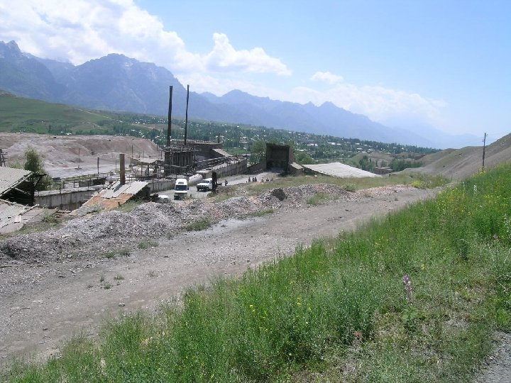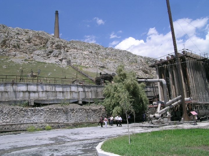 • Влияние на окружающую среду также оказывает вынос пыли, содержащей тяжелые металлы, с отвалов огарков и обезвоженных площадей хвостохранилища. • Комбинатом ежегодно в атмосферу выбрасывается 13, 22 тонн металлической ртути, 315, 9 тонн пыли, 295, 3 тонн оксида углерода и 45, 02 тонн диоксида серы. Выброс технологических отходов осуществляется через дымовую трубу на абсолютной отметке 1980 м над уровнем моря.