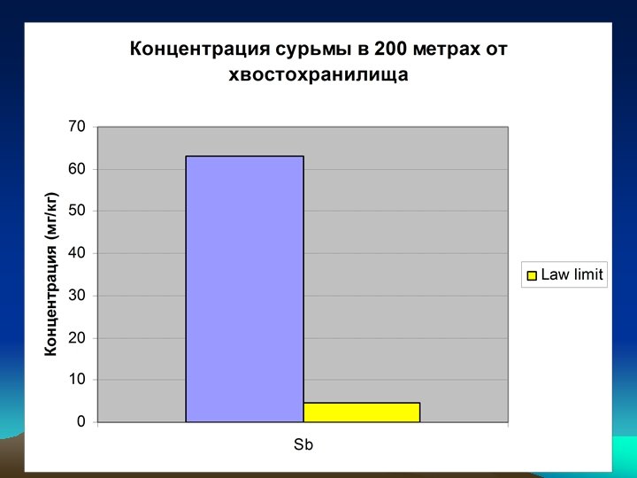 Анализ почвы западнее хвостохранилища – 200 м, произведенный в рамках проекта в лаборатории Алекса Стюарта в 16. 06. AS Cd Hg Pb Sb Zn F мг/кг мг/кг 19 п 2 д к < 0. 25 < 0. 5 15 63 41 7. 3 1 6 4, 5 110 10 2, 1