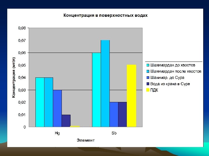 1. Поверхностные водные объекты По данным Министерства здравоохранения КР сурьма в воде реки Шахимардан определялась на всех участках исследования, причем в 74% исследованных проб ее концентрация превышала ПДК по максимальным значениям для воды водоемов (0, 05 мг/л). Наибольшие концентрации сурьмы определены в зоне размещения объектов комбината, у пос. Кадамджай (0, 4+0, 12 мг/л) и ниже, у пос. Пульгон (0, 64 =0, 24 мг/л), что в 100 раз и более раз выше, чем ПДК. Выше комбината и пос. Кадамджай содержание этого элемента уменьшается до 0, 19 -0, 20 мг/л, т. е примерно в 2 -3 раза ниже, но тем не менее превышает ПДК, что указывает на высокое природное содержание сурьмы в водах реки. Сброс условно-чистых промышленных сточных вод в реку Шахимардан осуществляется через ливневую канализацию. Поэтому увеличение концентрации сурьмы в пробах воды на расстоянии 2 км от сурьмяного комбината (ниже по течению), связано со сбросом сточных вод комбината. Из этого водоема осуществляется хозяйственно- питьевое водоснабжение жителей низлежащих сел-Пульгон, Вуадиль и далее вода поступает в г. Фергану.
