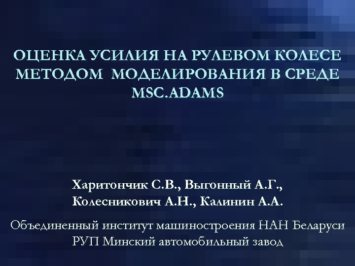 ОЦЕНКА УСИЛИЯ НА РУЛЕВОМ КОЛЕСЕ МЕТОДОМ МОДЕЛИРОВАНИЯ В СРЕДЕ MSC. ADAMS Харитончик С. В. , Выгонный А. Г. , Колесникович А. Н. , Калинин А. А. Объединенный институт машиностроения НАН Беларуси РУП Минский автомобильный завод