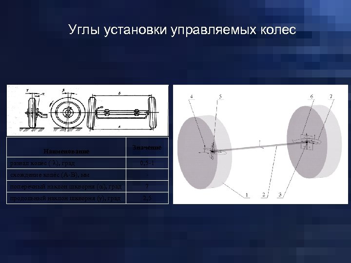 Углы установки управляемых колес Наименование развал колёс ( ), град Значение 0, 5 -1 схождение колёс (А-В), мм - поперечный наклон шкворня ( ), град 7 продольный наклон шкворня ( ), град 2, 5