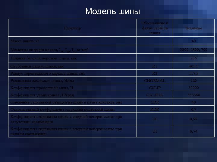 Модель шины Параметр Обозначение в файле свойств шины Масса шины, кг Значение 40 Моменты инерции колеса, Ixx, Iyy, Izz, кг мм 4 2800, 700 Ширина беговой дорожки шины, мм 235 Свободный радиус шины, мм R 1 405, 5 Радиус тороидального каркаса шины, мм R 2 117, 5 Радиальная жесткость шины, Н/мм CNORMAL 920 Коэффициент продольной силы, Н CSLIP 30000 Коэффициент увода колеса, Н/град CALPHA 335368 Смещение радиальной реакции на шину в пятне контакта, мм CRR 40 Относительный коэффициент затухания колебаний шины RDR 0, 7 Коэффициента сцепления шины с опорной поверхностью при отсутствии скольжения U 0 0, 99 Коэффициента сцепления шины с опорной поверхностью при полном скольжении U 1 0, 74