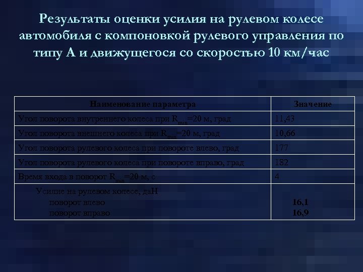 Результаты оценки усилия на рулевом колесе автомобиля с компоновкой рулевого управления по типу А и движущегося со скоростью 10 км/час Наименование параметра Значение Угол поворота внутреннего колеса при Rmin=20 м, град 11, 43 Угол поворота внешнего колеса при Rmin=20 м, град 10, 66 Угол поворота рулевого колеса при повороте влево, град 177 Угол поворота рулевого колеса при повороте вправо, град 182 Время входа в поворот Rmin=20 м, с 4 Усилие на рулевом колесе, да. Н поворот влево поворот вправо 16, 1 16, 9