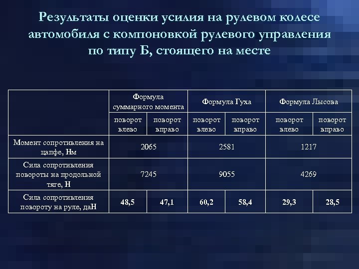 Результаты оценки усилия на рулевом колесе автомобиля с компоновкой рулевого управления по типу Б, стоящего на месте Формула суммарного момента поворот влево поворот вправо Формула Гуха поворот влево поворот вправо Формула Лысова поворот влево Момент сопротивления на цапфе, Нм 2065 2581 1217 Сила сопротивления повороты на продольной тяге, Н 7245 9055 поворот вправо 4269 Сила сопротивления повороту на руле, да. Н 48, 5 47, 1 60, 2 58, 4 29, 3 28, 5