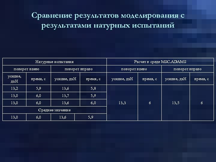 Сравнение результатов моделирования с результатами натурных испытаний Натурные испытания поворот влево Расчет в среде MSC. ADAMS поворот вправо усилие, да. Н время, с 13, 2 5, 9 13, 6 6, 0 13, 7 5, 9 13, 0 6, 0 13, 6 6, 0 поворот вправо 5, 8 13, 0 поворот влево Среднее значение 13, 0 6, 0 13, 6 5, 9 усилие, да. Н время, с 13, 3 6 13, 5 6