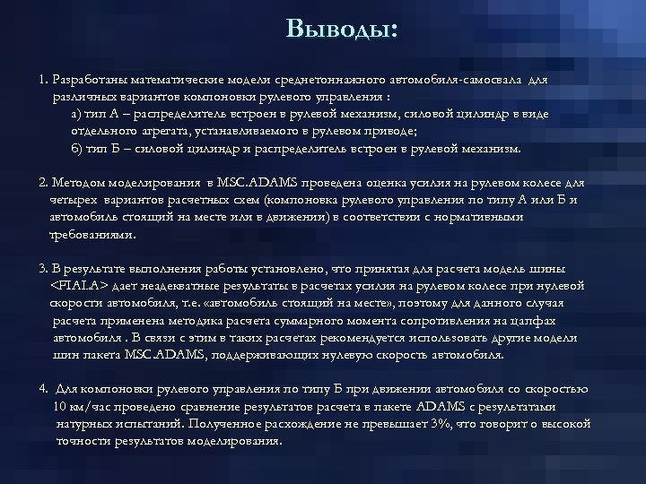 Выводы: 1. Разработаны математические модели среднетоннажного автомобиля-самосвала для различных вариантов компоновки рулевого управления : а) тип А – распределитель встроен в рулевой механизм, силовой цилиндр в виде отдельного агрегата, устанавливаемого в рулевом приводе; б) тип Б – силовой цилиндр и распределитель встроен в рулевой механизм. 2. Методом моделирования в MSC. ADAMS проведена оценка усилия на рулевом колесе для четырех вариантов расчетных схем (компоновка рулевого управления по типу А или Б и автомобиль стоящий на месте или в движении) в соответствии с нормативными требованиями. 3. В результате выполнения работы установлено, что принятая для расчета модель шины