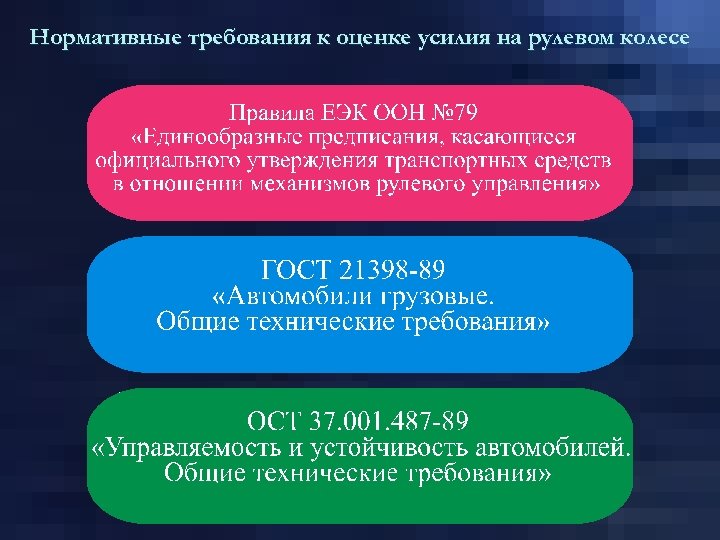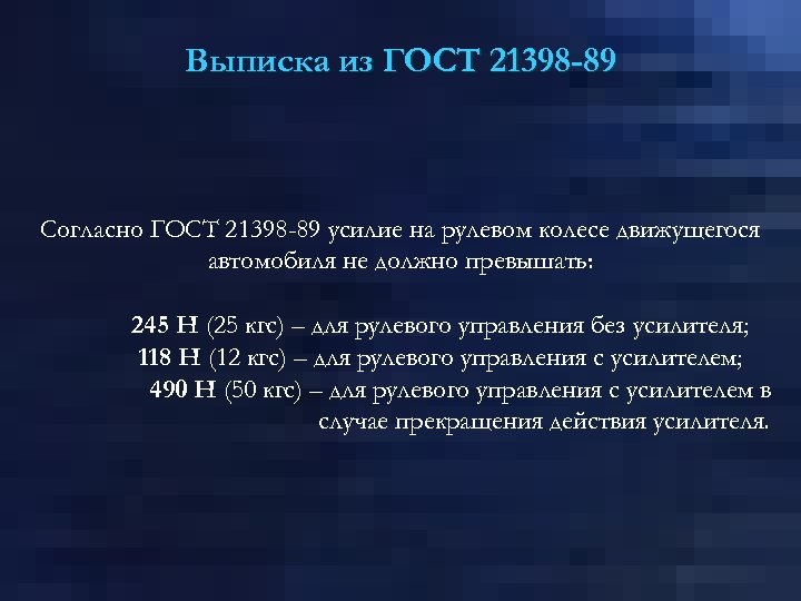 Выписка из ГОСТ 21398 -89 Согласно ГОСТ 21398 -89 усилие на рулевом колесе движущегося автомобиля не должно превышать: 245 Н (25 кгс) – для рулевого управления без усилителя; 118 Н (12 кгс) – для рулевого управления с усилителем; 490 Н (50 кгс) – для рулевого управления с усилителем в случае прекращения действия усилителя.