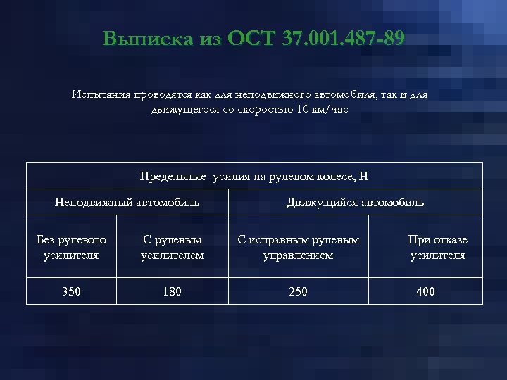 Выписка из ОСТ 37. 001. 487 -89 Испытания проводятся как для неподвижного автомобиля, так и для движущегося со скоростью 10 км/час Предельные усилия на рулевом колесе, Н Неподвижный автомобиль Движущийся автомобиль Без рулевого усилителя С рулевым усилителем С исправным рулевым управлением 350 180 250 При отказе усилителя 400