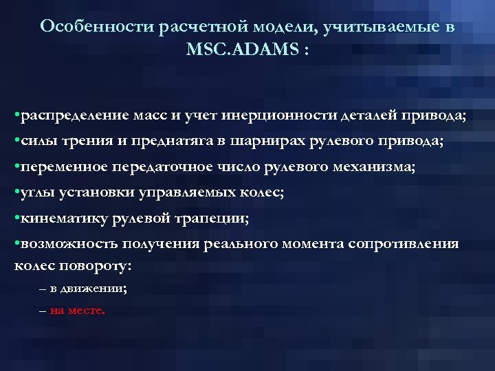 Особенности расчетной модели, учитываемые в MSC. ADAMS : • распределение масс и учет инерционности деталей привода; • силы трения и преднатяга в шарнирах рулевого привода; • переменное передаточное число рулевого механизма; • углы установки управляемых колес; • кинематику рулевой трапеции; • возможность получения реального момента сопротивления колес повороту: – в движении; – на месте.