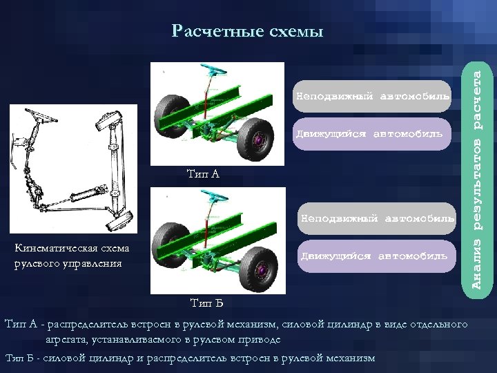 Расчетные схемы Тип А Кинематическая схема рулевого управления Тип Б Тип А - распределитель встроен в рулевой механизм, силовой цилиндр в виде отдельного агрегата, устанавливаемого в рулевом приводе Тип Б - силовой цилиндр и распределитель встроен в рулевой механизм