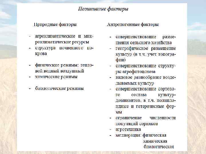 По характеру действия на агроэкосистемы природные и антропогенные факторы могут быть: • лимитирующими, • нормальными, • оптимальными, • угнетающими. Антропогенное воздействие может быть: • непосредственным (например, вспашка поля) • опосредованным (корневые выделения растений губительно действуют на другие, культурные растения). Используется и группировка факторов по типам: позитивные негативные