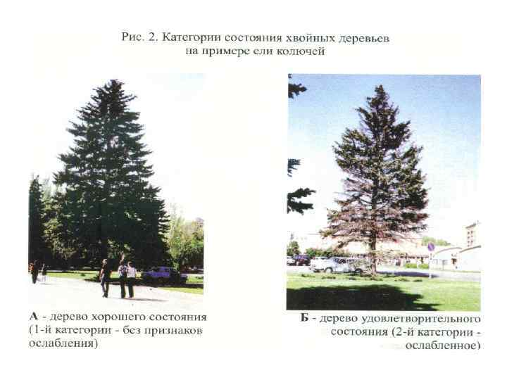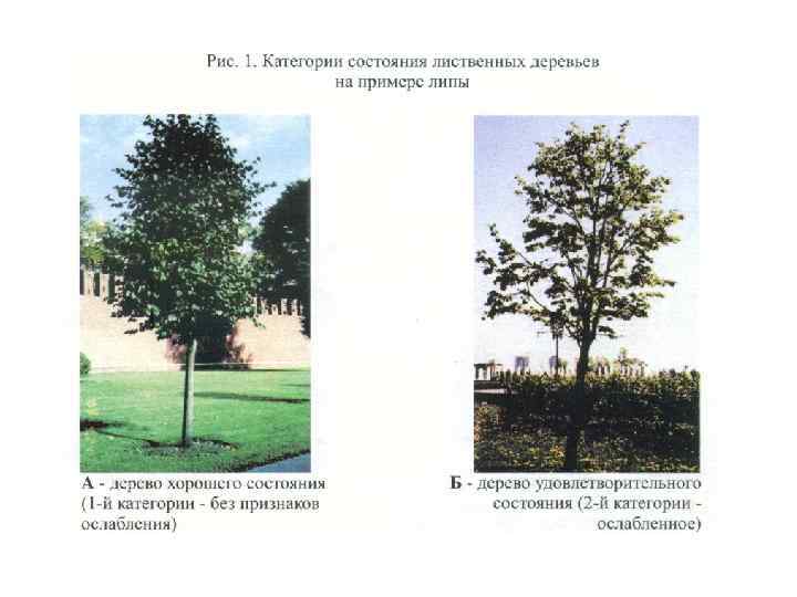 В городских насаждениях принято разделять деревья на три группы качественного состояния: 1 – хорошее, 2 – удовлетворительное, 3 – неудовлетворительное. На основании действующих «Санитарных правил в лесах России» выделяют 6 категорий состояния (жизнеспособности) деревьев: 1 – деревья без признаков ослабления, 2 – ослабленные, 3 – сильно ослабленные, 4 – усыхающие, 5 – сухостой текущего года (усыхающие в текущем году), 6 – сухостой прошлых лет.